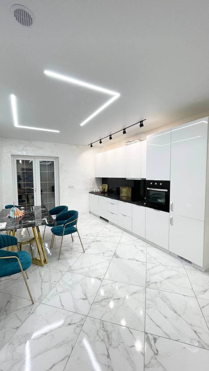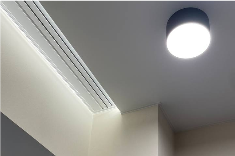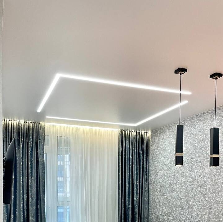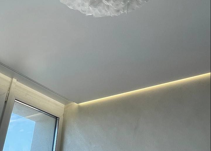 - Был установлен алюминиевый скрытый карниз с дотяжкой и подсветкой 3 м/п